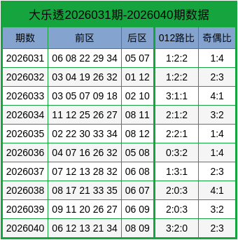 大乐透第26040期开出奖号:前区06、12、13、21、34;后区08、09。其中前区012路比为3:2:0,奇偶比2:3,后区四分区均开出3区号码。